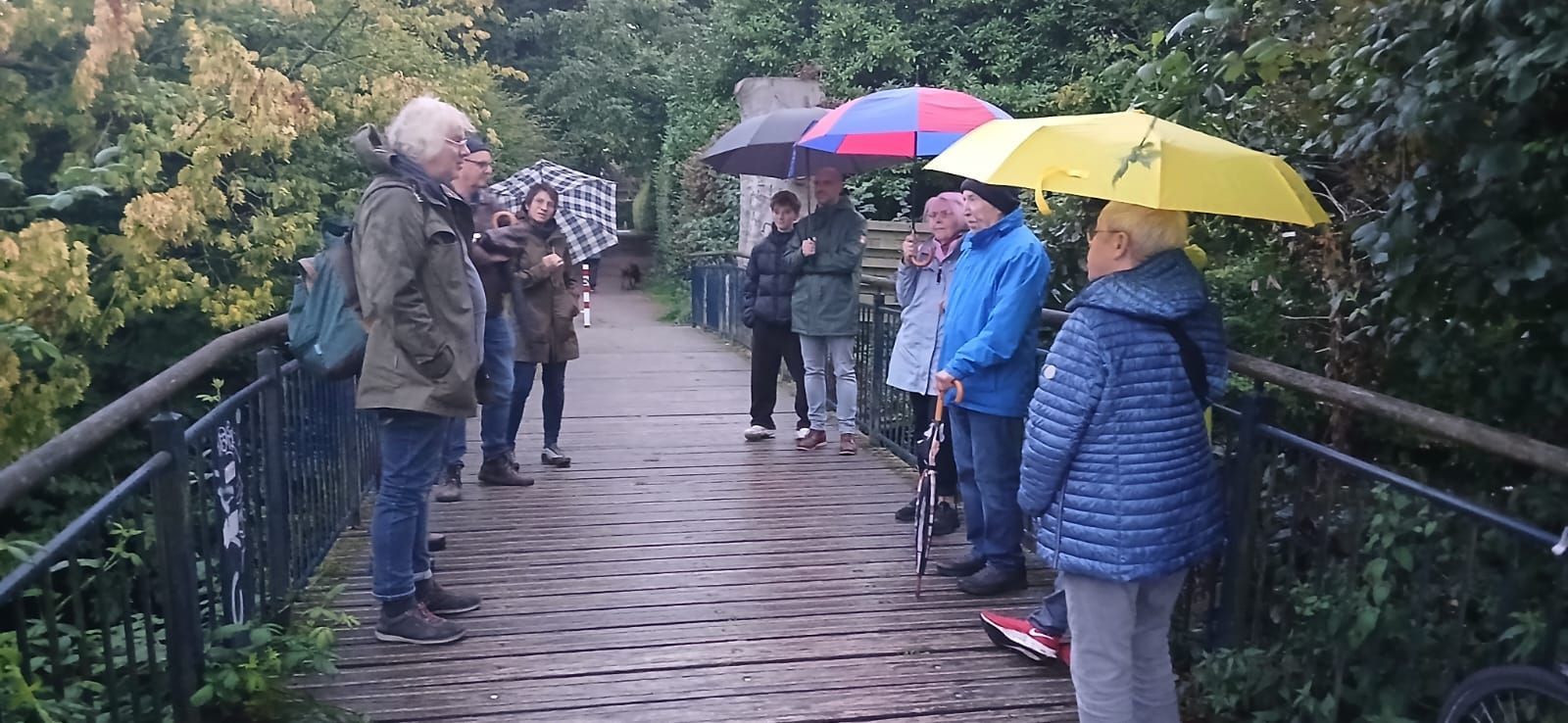 (zwei Personen sind auf dem Foto verdeckt). Glücklicherweise hörte der Regen kurz nach Beginn der Führung auf, denn Fledermäuse mögen keinen Regen & starken Wind. Drei Teilnehmer bekamen akustische Ultraschal-Verstärker, damit wurden ihre Laute (ca. 40 kHz) für uns Menschen hörbar. Wir haben an verschieden Abschnitten Fledermäuse ausmachen können. Sie sind teilweise bis auf 10 cm über uns hinweggeflogen!