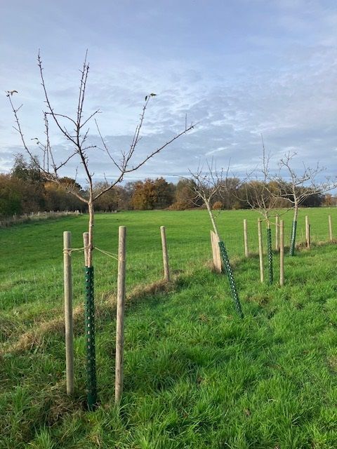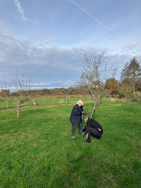 Zusammen mit zwei Expertinnen der Unteren Naturschutzbehörde hat Frau von Alten am 12.11.25 auf der Streuobstwiese die Aktion „Baumschutz“ durchgeführt.